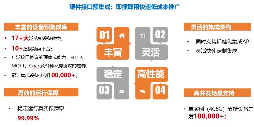迄今jiuyou.com九游公司已经预集成17+大泛感知设备种类,10+泛视频类平台,广泛接口协议的预集成能力涵盖了HTTP、MQTT、Coap及各种私有协议的定制,累计集成设备实例达100,000+。它还支持标准化集成API,可灵活快速地定制集成,通过构建规则引擎,实现了各设备间的联动应用,比如检测到违规停车,联动广播就会自动播报提醒,为社区管理服务赋能。